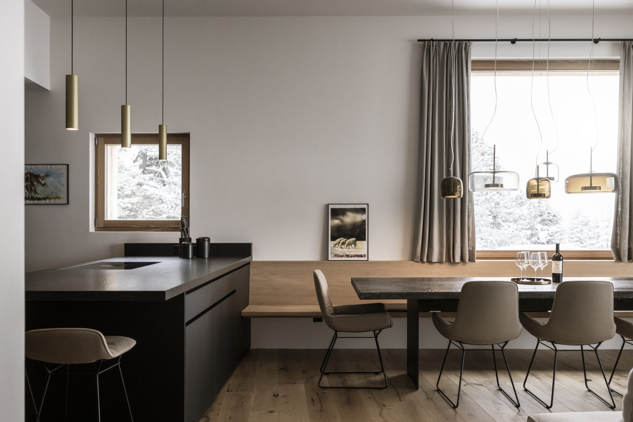 WOHNUNG 1 3 7 7 – Die Wohnung befindet sich im Dachgeschoss eines Annexbaus, der an einen bestehenden Wohn- / Hotelkomplex angebaut wurde. Nahe der Durchfahrtsstrasse wird erst auf den zweiten Blick deutlich, dass der Panoramablick aus dem Rauminneren nachhaltig beeindruckt. Überdurchschnittliche Raumhöhen mit grossen Fenstern stellen die Assoziation zu einem Loft her. Zugleich fühlt man sich geborgen, da die uneinsichtige Lage in der obersten Etage absolute Privatsphäre sicherstellt. Die Wohnung bietet einer Familie ein Ferien-Zuhause, in welchem die Balance zwischen Grosszügigkeit für Gemeinschaft, und Kleinteiligkeit für den Rückzug gefunden wurde. Im Innenausbau nehmen die verwendeten Materialien Bezug auf die alpine Örtlichkeit, zeigen ihren Charakter in rauen Oberflächen und bilden einen durchgehend schlichten und stimmigen Hintergrund zu der spektakulären Aussicht.